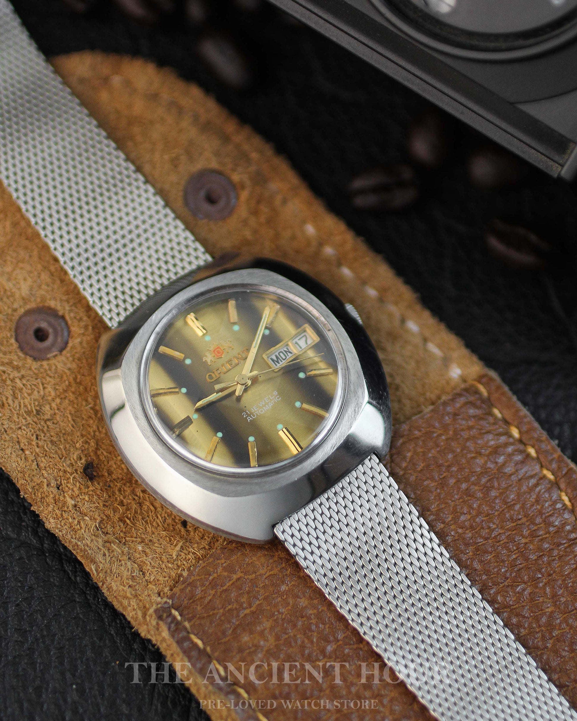 The Orient Tiger Eye Dial Ref. 3194-6216-038 serves as a 21 Jewels Automatic watch